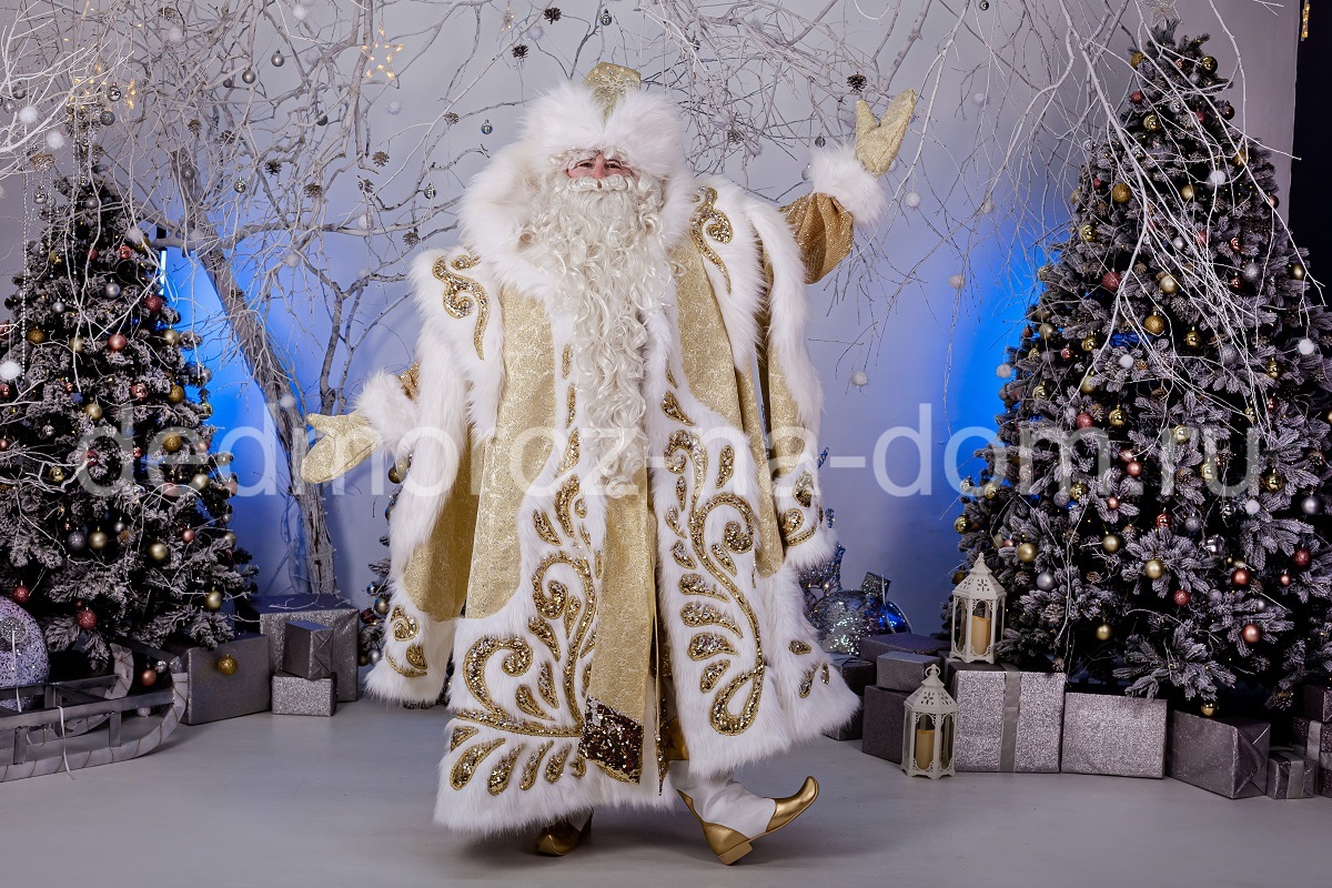 Красная шуба Деда Мороза, которая отстрочена белым мехом и украшена кружевом, создаёт атмосферу таинственной сказки. Под шубой находится длинная белая рубаха. В комплект входят варежки и шапка с мехом и кружевом.