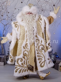 Этот костюм – выбор самого настоящего Деда Мороза! И не зря. Несмотря на кажущуюся простоту костюма – пастельный цвет с неярким узором, белые меховые вставки и отстрочки с золотистым обрамлением – он достаточно богат за счёт качественной ткани и довольно крупных камней на манжетах. В комплект костюма также входят варежки, борода и высокая белая меховая шапка.