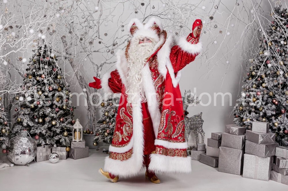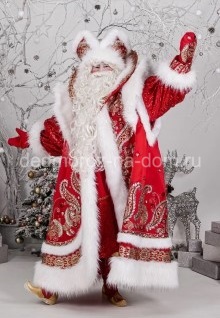 Этот костюм Деда Мороза сделан из красного бархата с красными узорами, что делает цвет интенсивнее, а саму шубу более красивой и интересной. Шуба также разрисована причудливыми серебристыми узорами и украшена большими растительными орнаментами со стразами того же цвета. Край шубу отделан коротким белым мехом. Из этого же меха сделаны манжеты, воротник и край шапки. Под шубой у Деда Мороза находится длинная белая рубаха с серебристыми манжетами, которая подпоясывается широким красным поясом. Внизу рубаха украшена широкой серебристой тесьмой.