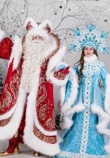 «Царская красно-золотая» Снегурочка отлично подойдёт в напарницы к Деду Морозу в «Царском красном» костюме. Вместе они составляют полный и законченный образ. Этот же костюм есть и в синем варианте для Деда Мороза в «Царском синем» костюме. |