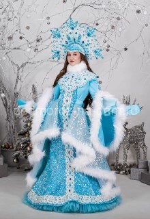 Восхитительный костюм Снегурочки поразит воображение любого человека. Длинная серебристая рубаха украшена белыми кружевами, поверх надевается серебристая накидка, отстроченная коротким белым мехом и кружевом. На голову же надевается невероятной красоты кокошник с вышивкой, мехом и кружевом, который дополнен невесомой полупрозрачной фатой, что придаёт образу сказочности.