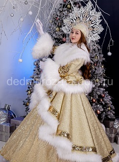 Снегурочка в золотом костюме является неотъемлемым компаньоном Деда Мороза в «Таёжном» костюме. Красивая и переливающаяся ткань, из которой выполнен костюм, заворожит любого! |
