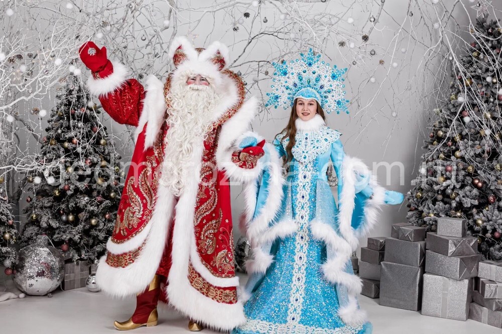 «Царская сине-золотая» Снегурочка отлично гармонирует с Дедом Морозом в «Царском синем» костюме. Этот же костюм есть и в красном варианте. Костюм сделан из синей ткани и украшен узорами серебряного цвета. |