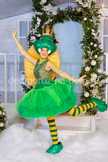 Снегурочка облачена в короткое платье с открытыми плечами. Воротник и подол платья обрамляет мех, также как и манжеты перчаток. Платье выполнено из той же ткани, что и шуба у Деда Мороза в «Аристократичном» костюме. Снегурочка обута в высокие белые сапоги, а на голове у неё красуется длинный бордово-золотой колпачок с меховым помпоном и краем. |